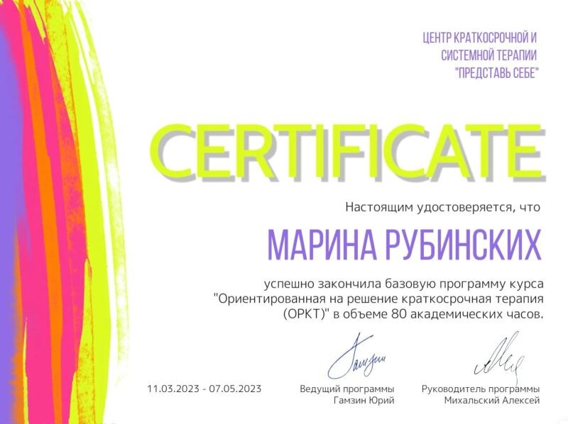 - Центр краткосрочной и системной терапии «Представь себе», курс «Ориентированная на решение краткосрочная терапия», 2023 г.