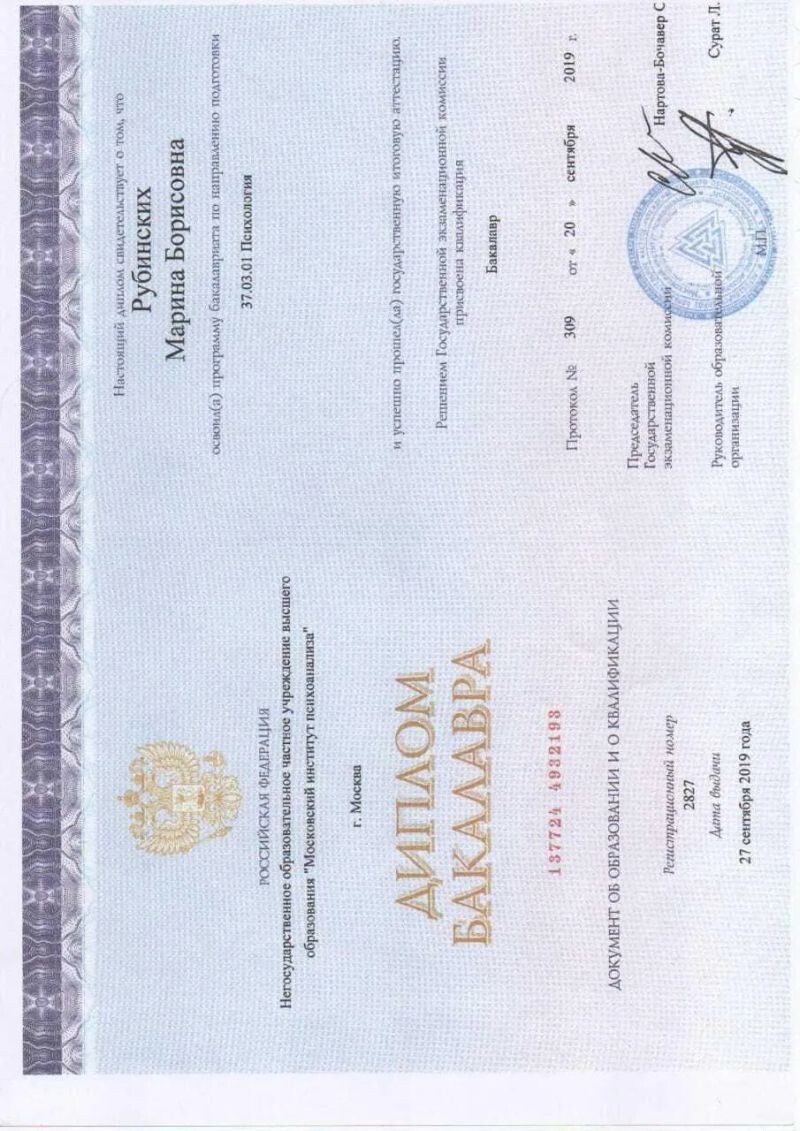 - Московский институт психоанализа, Психолог, 2016–2019 гг.