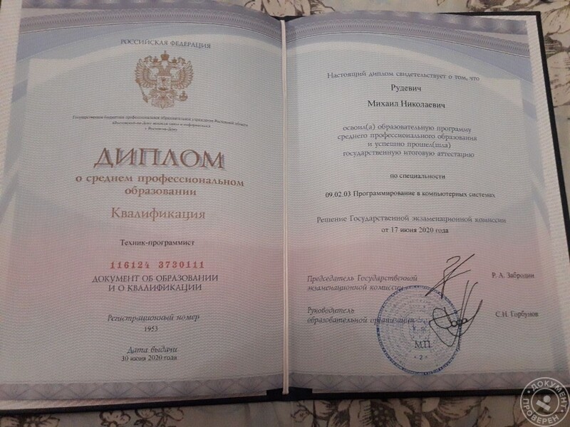 - Ростовский-на-Дону колледж связи и информатики, программирование в компьютерных системах, 2016–2020 гг.
