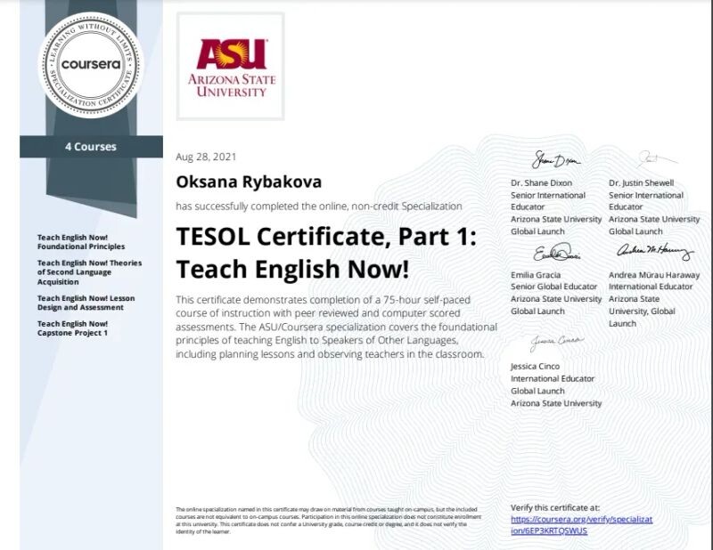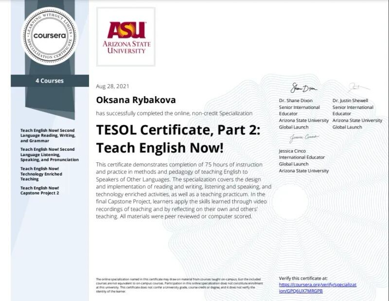 - Specialization: The Pronunciation of American English. University of California, 2022 г.