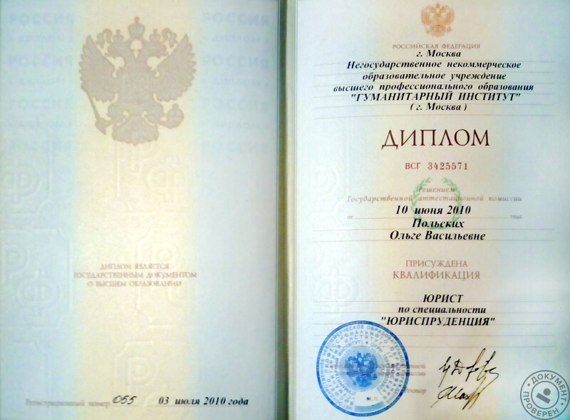 - Гуманитарный институт, юридический факультет, специальность – юриспруденция, квалификация – юрист, 2010 г.