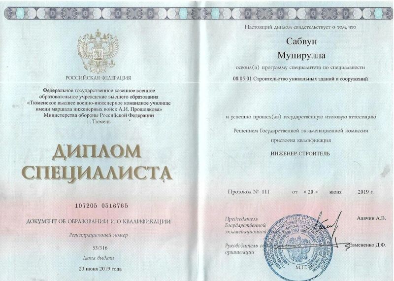 - ТВВИКУ, квалификация — инженер-строитель, 2013–2019 гг.