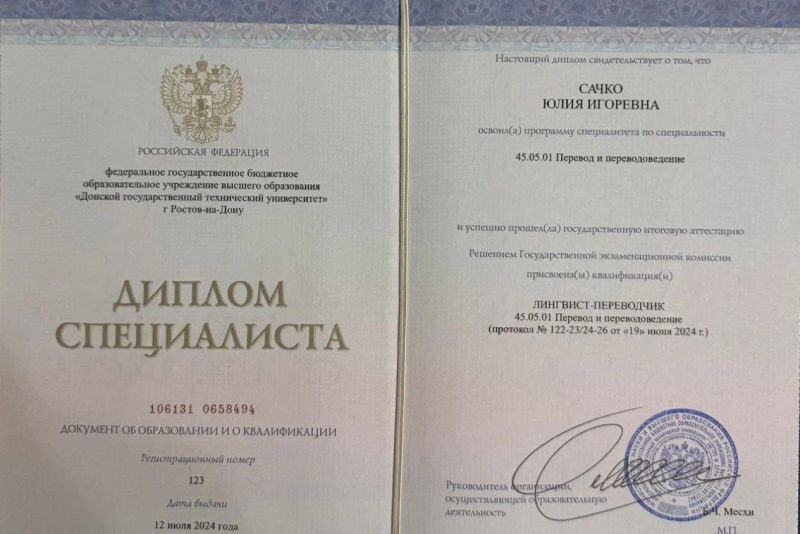 - Донской Государственный Технический Университет, специализация: Лингвист-переводчик (перевод и переводоведение), 2019–2024 гг.