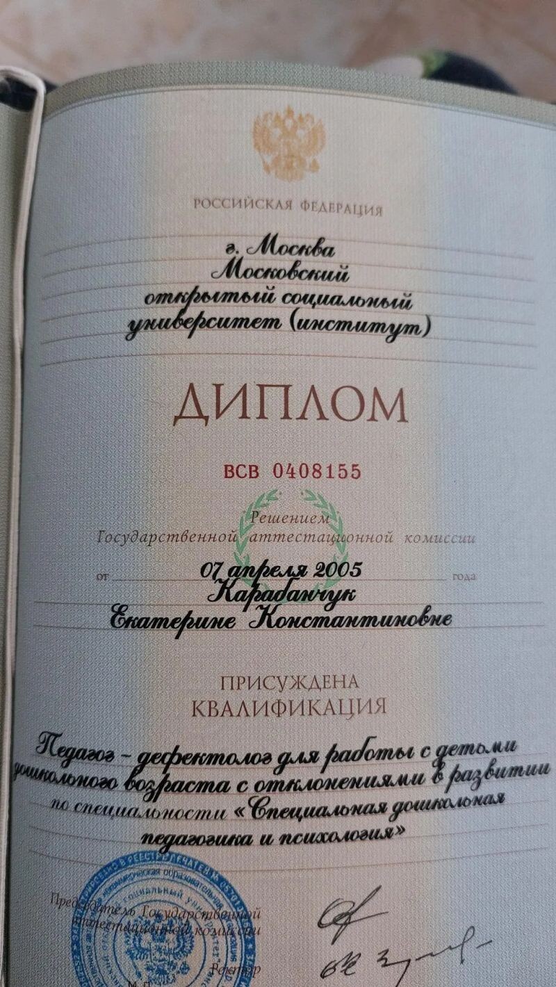 - Московский открытый социальный университет Педагог-дефектолог для работы с детьми дошкольного возраста с отклонениями в развитии (с 2005 г.).