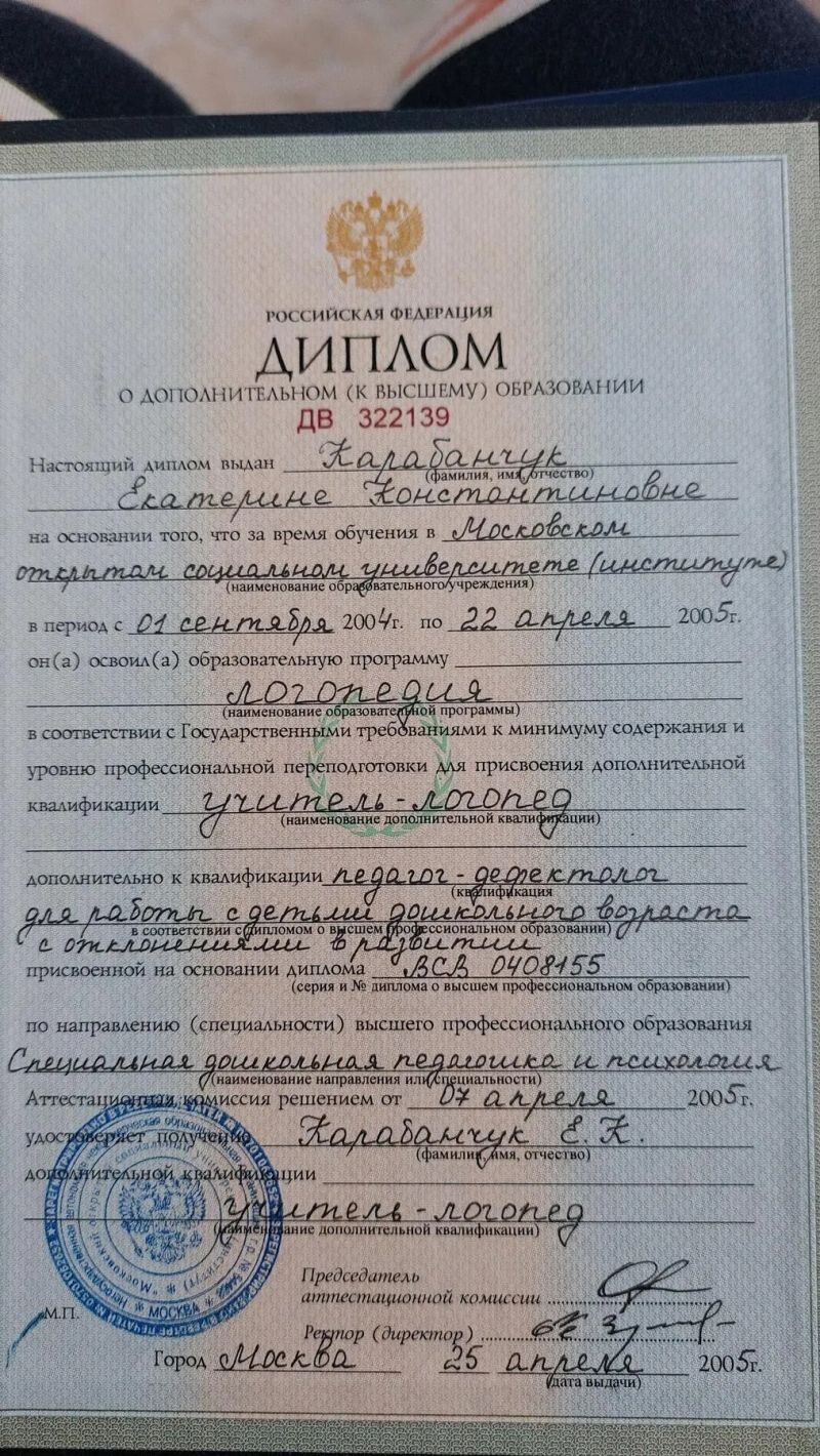 - Московский открытый социальный университет Присвоена квалификация Учитель-логопед (с 2005 г.).