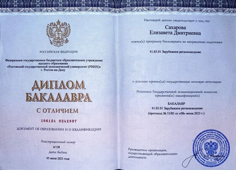 - Ростовский государственный экономический университет, зарубежное регионоведение, 2019–2023 гг.