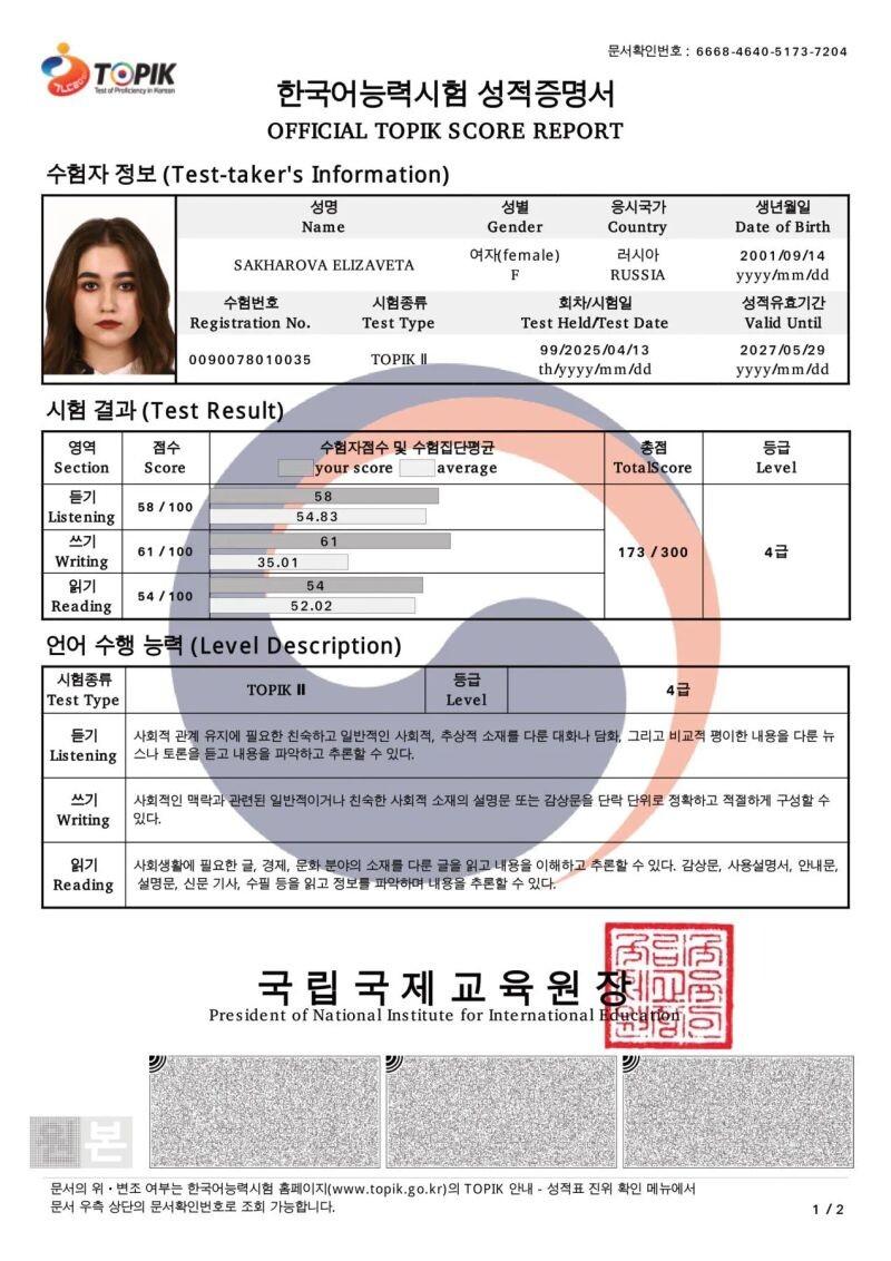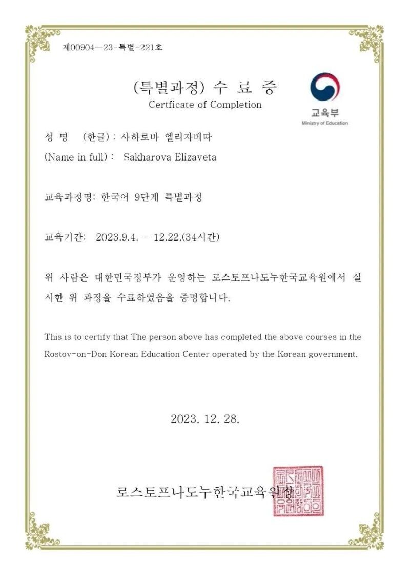 - Корейский образовательный центр в Ростове-на-Дону, специальный курс корейского языка, 2019–2023 гг.