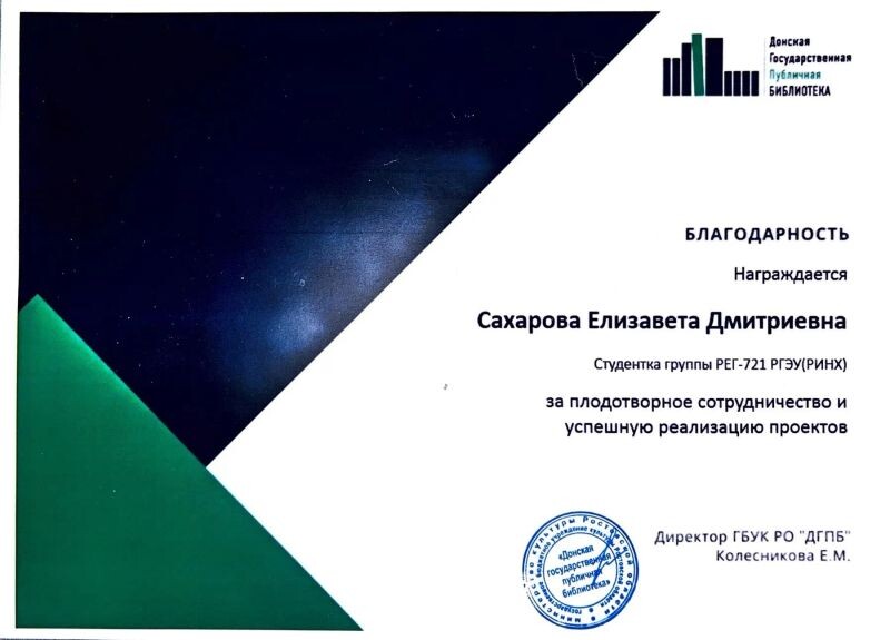 - Донская государственная публичная библиотека, благодарственное письмо, 2023 г.
