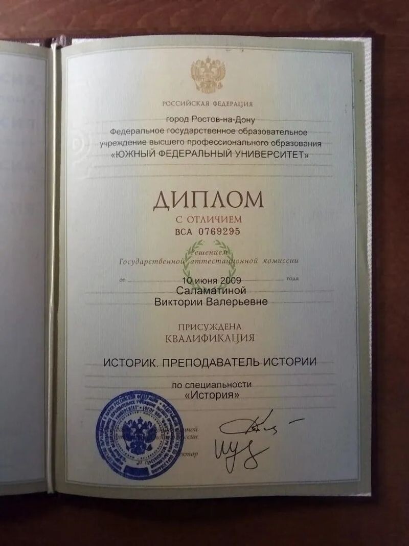 - Южный федеральный университет, исторический факультет, диплом с отличием, квалификация – историк, преподаватель истории, 2003–2009 гг.