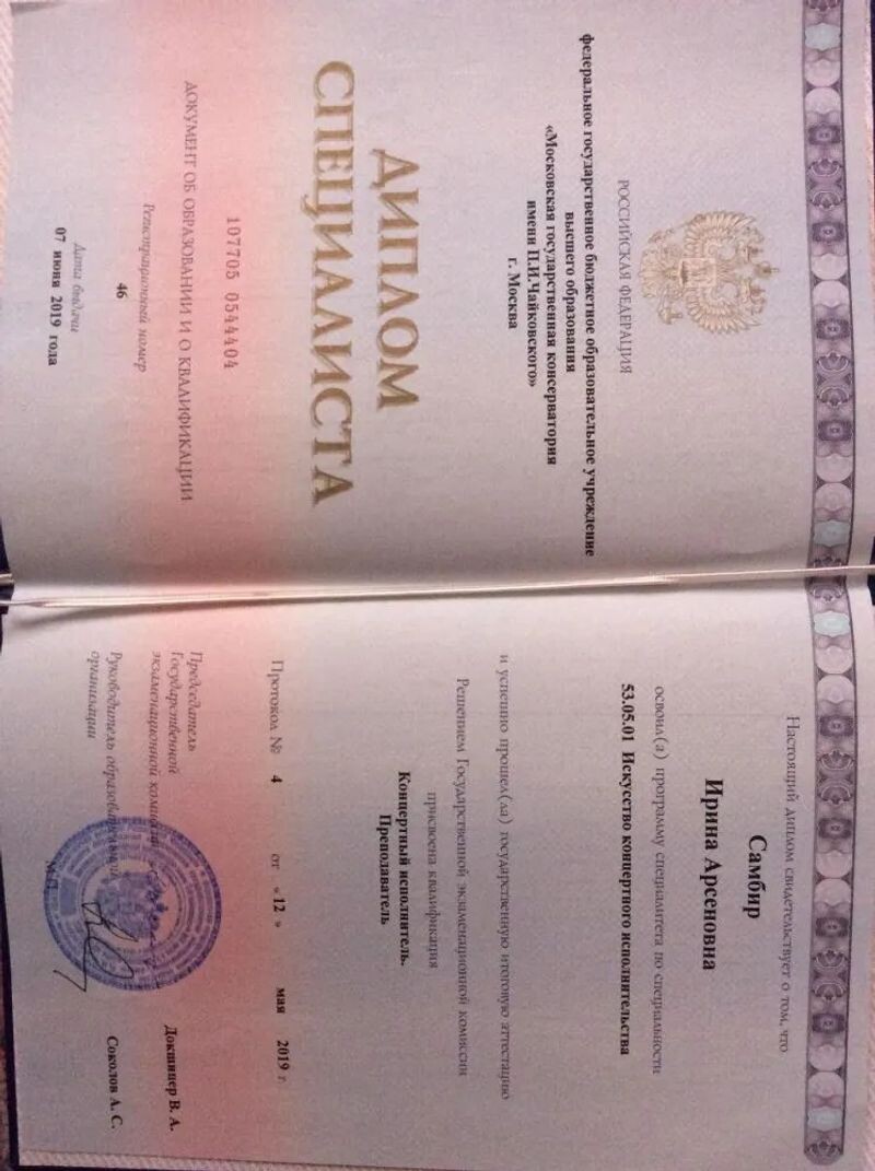 - Московская государственная консерватория им. П. И. Чайковского, искусство концертного исполнительства, 2014–2019 гг.