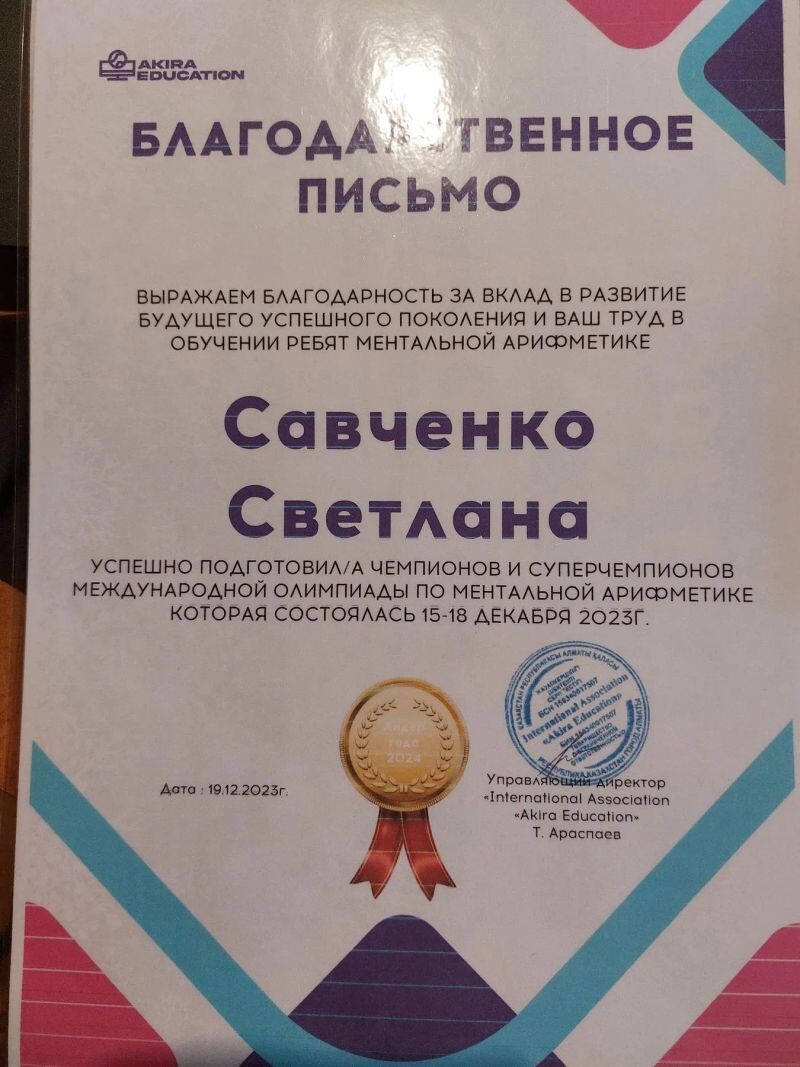 - International Association Akira Education, грамота за подготовку чемпионов и суперчемпионов 11-й международной олимпиады по ментальной арифметике «Akira Battle — Монстры не сдаются», 2024 г.