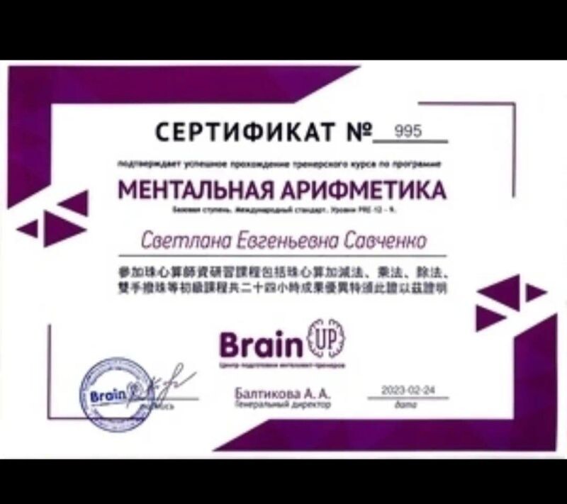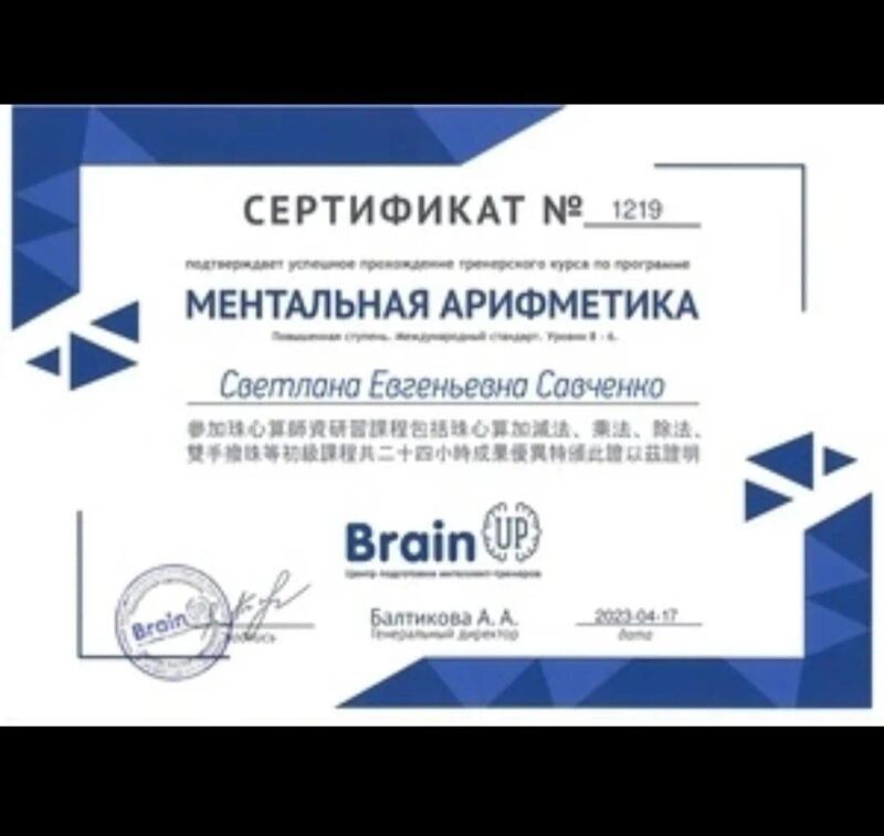 - Академия интеллект-тренеров BrainUp, курс «Ментальная арифметика» (уровень базовый), 2023 г.