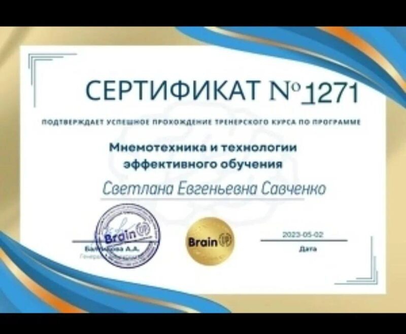 - Академия интеллект-тренеров BrainUp, курс «Мнемотехника и технологии эффективного обучения», 2023 г.