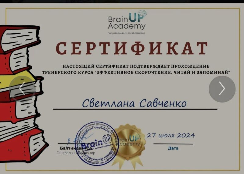 - Академия интеллект-тренеров BrainUp , тренерский курс «Эффективное скорочтение. Читай и запоминай», 2024 г.