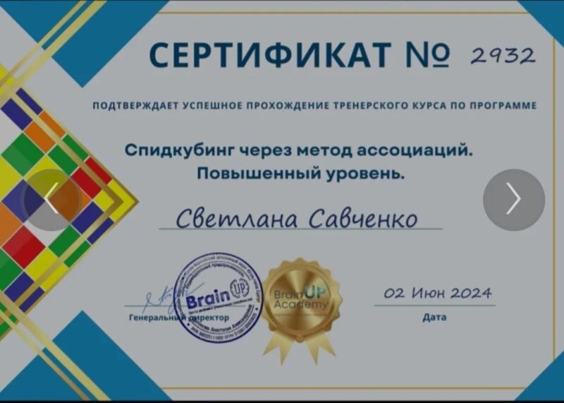 - Академия интеллект-тренеров BrainUp, тренерский курс «Спидкубинг через метод ассоциаций. Уровень повышенный», 2024 г.