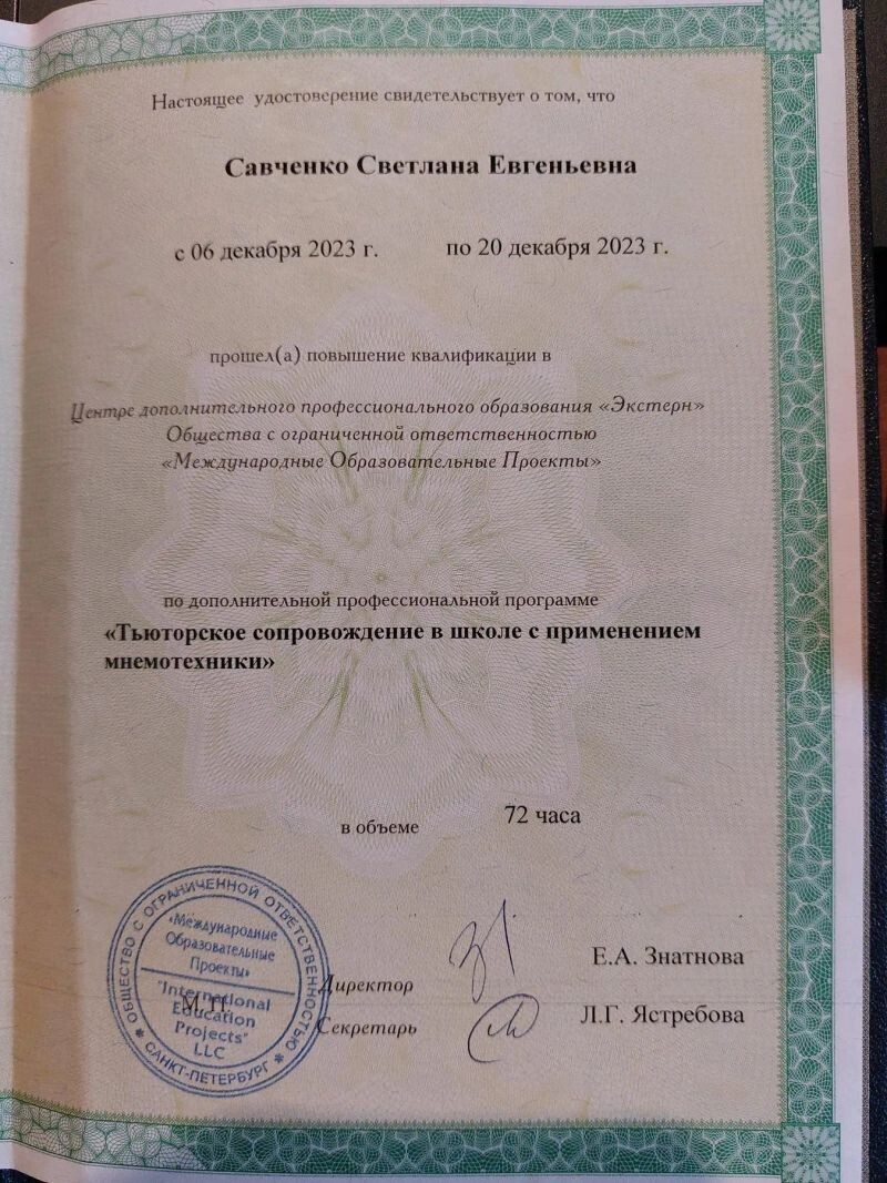 - Центр дополнительного профессионального образования «Экстерн», повышение квалификации по программе «Тьюторское сопровождение в школе с применением мнемотехники», 2023 г.