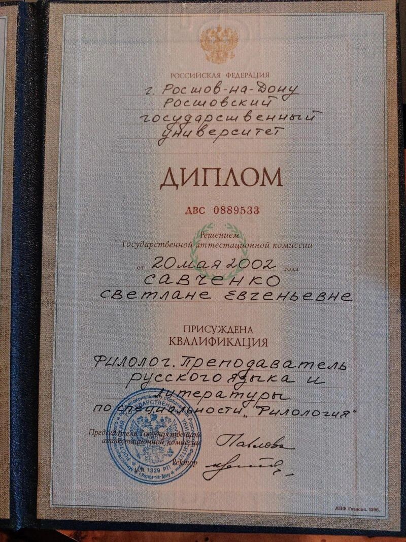 - Ростовский государственный университет, филология, 1995–2002 гг.