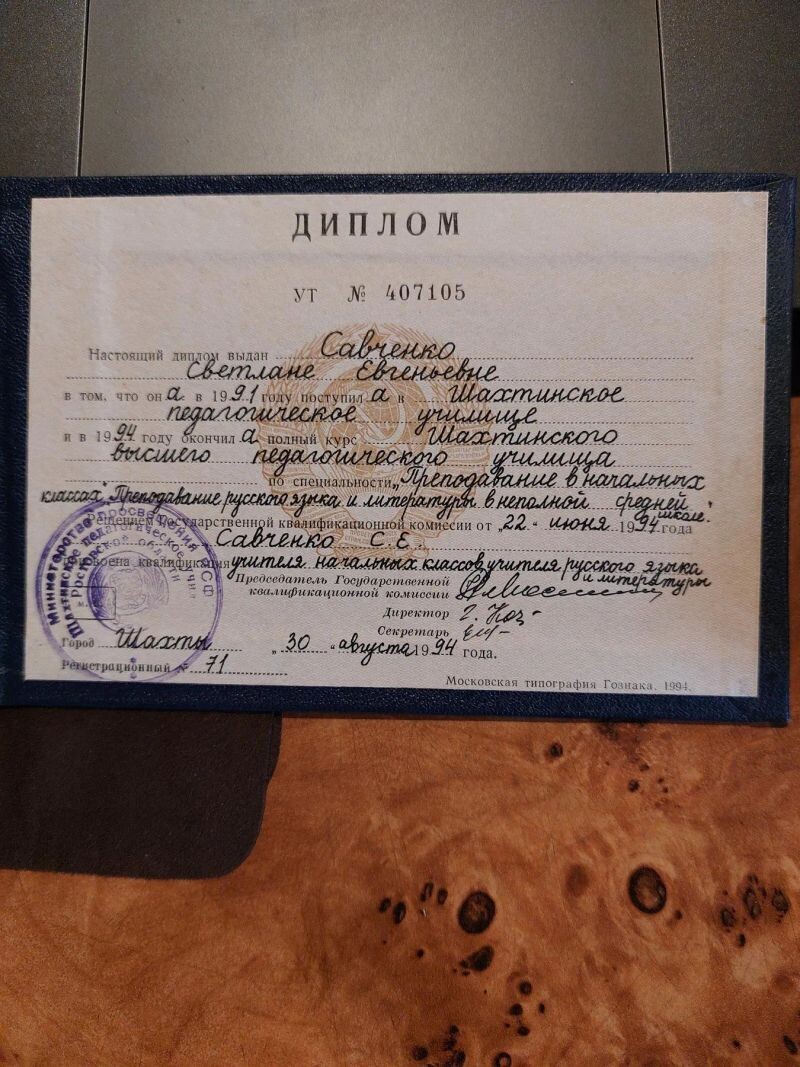 - Шахтинское высшее педагогического училище, преподавание в начальных классах, 1991–1994 гг.