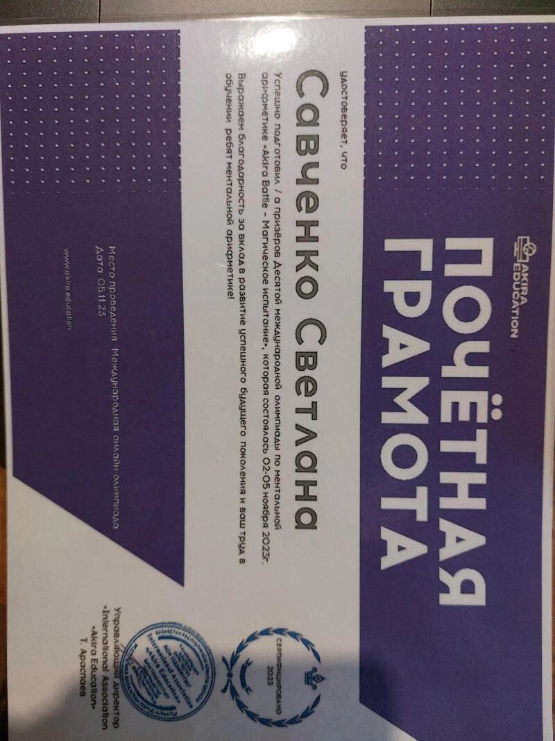 - International Association Akira Education, грамота за подготовку призёров Десятой Международной олимпиады по ментальной арифметике «Akira Battle — Магическое испытание», 2023 г.