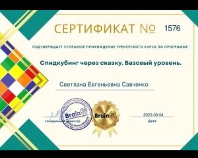- Академия интеллект-тренеров BrainUp, тренерский курс «Спидкубинг через сказку. Уровень Базовый», 2023 г.