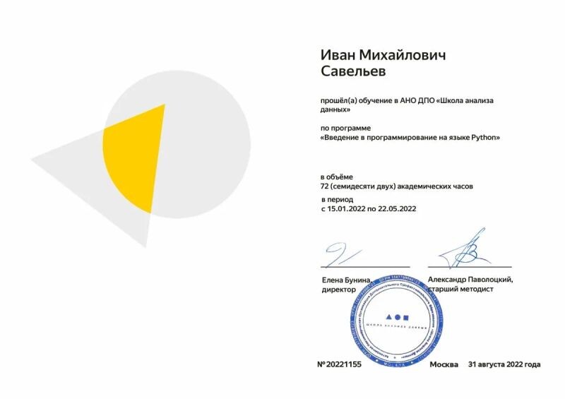 - Повышение квалификации "Введение в программирование на языке Python» («Школа анализа данных», Лицей Академии Яндекса, г. Москва) (с 2022 г.).