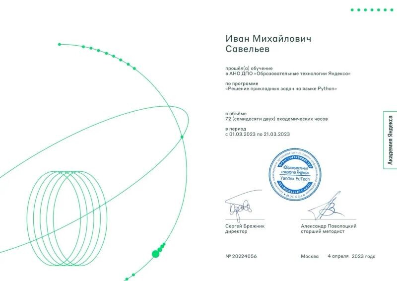 - Повышение квалификации "Решение прикладных задач на языке Python" («Образовательные технологии Яндекса», Академия Яндекса, г. Москва) (с 2023 г.).