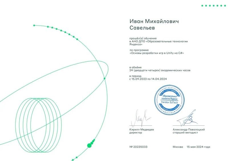 - Повышение квалификации "Основы разработки игр в Unity на C#" («Образовательные технологии Яндекса», г. Москва) (с 2024 г.).