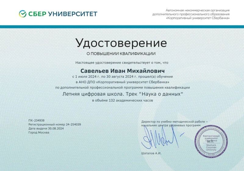 - Повышение квалификации "Наука о данных: Машинное обучение, Погружение в AI" («Корпоративный университет Сбербанка», г. Москва) (с 2024 г.).