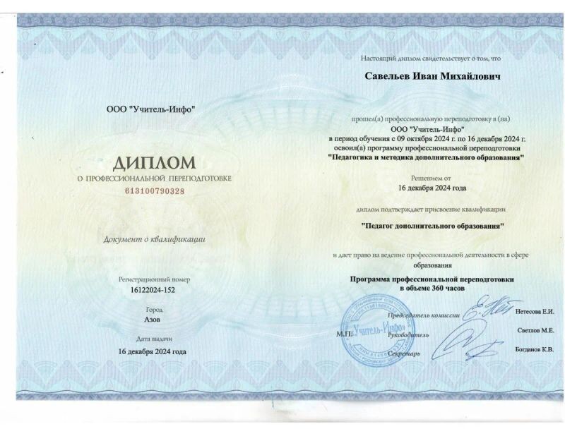 - Профессиональная переподготовка "Педагогика и методика дополнительного образования", квалификация "Педагог дополнительного образования" (с 2024 г.).