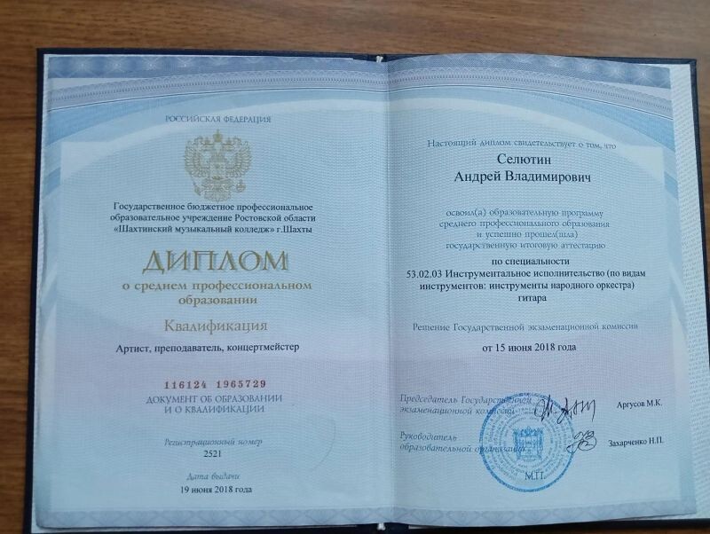 - Шахтинский музыкальный колледж, инструментальное исполнительство, гитара, 2014–2018 гг.