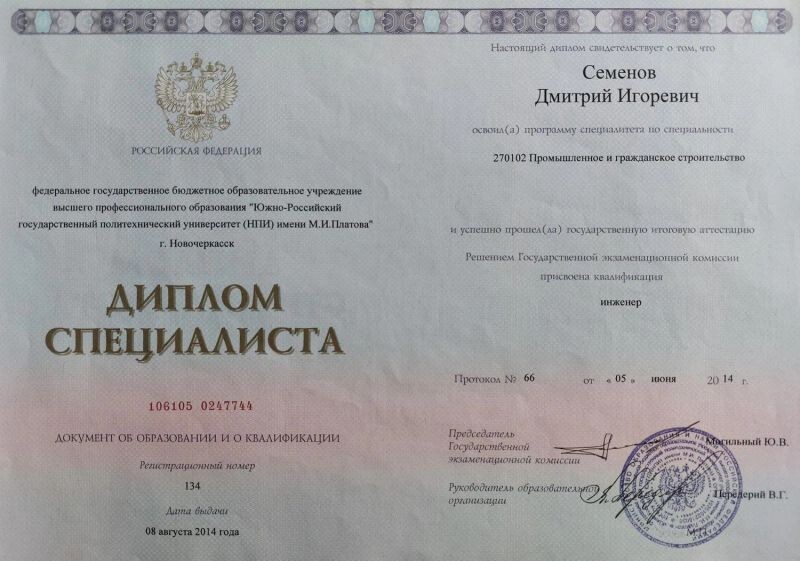 - Южно-Российский государственный политехнический университет (НПИ) им. М.И. Платова г. Новочеркасск, промышленное и гражданское строительство, 2009–2014 гг.