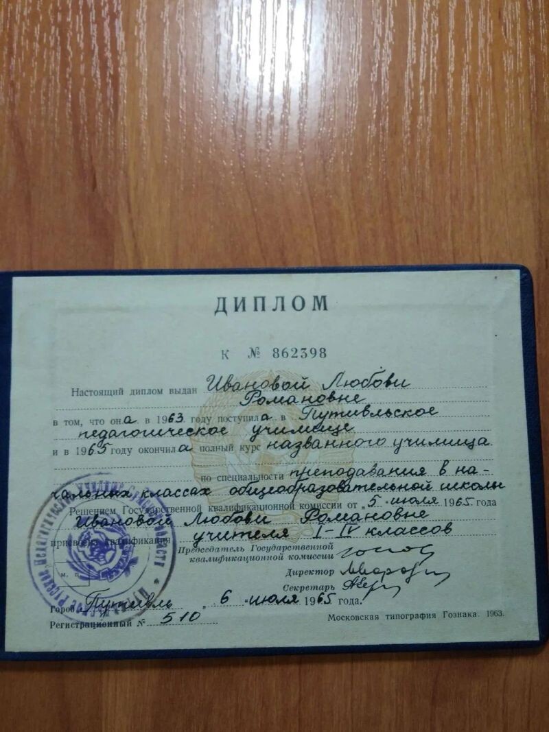 - Путивльское педагогическое училище, специальность «учитель начальных классов», 1963–1965 гг.