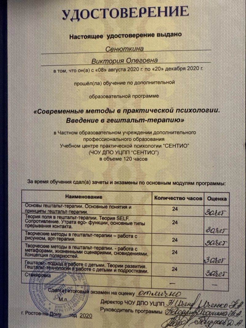 - Учебный центр практической психологии «СЕНТИО», современные методы в практической психологии, введение в гештальт-терапию, 2020 г.