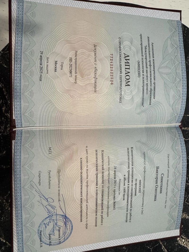 - Учебный центр практической психологии «СЕНТИО», психологическое консультирование, интегративный подход, 2021–2022 гг.