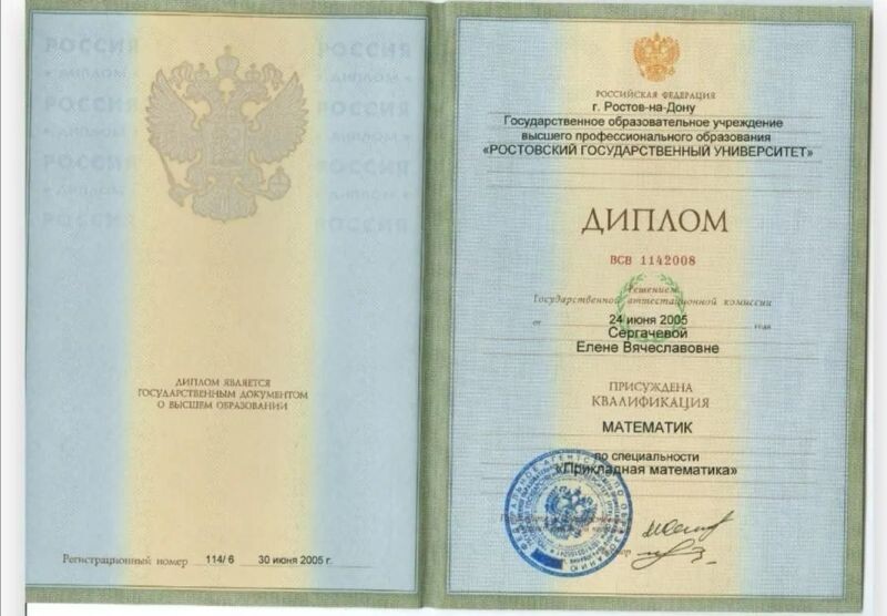 - ГОУ ВПО «РГУ», квалификация «математик» по специальности «Прикладная математика», 2005 г.