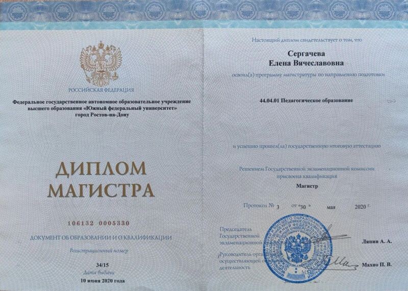 - ФЕДЕРАЛЬНОЕ ГОСУДАРСТВЕННОЕ АВТОНОМНОЕ ОБРАЗОВАТЕЛЬНОЕ УЧРЕЖДЕНИЕ ВЫСШЕГО ОБРАЗОВАНИЯ "ЮЖНЫЙ ФЕДЕРАЛЬНЫЙ УНИВЕРСИТЕТ" Педагогическое образование Магистр, 2017–2020 гг.