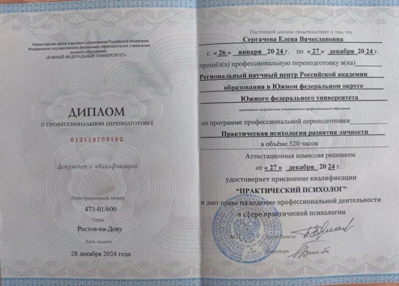 - Южный федеральный университет, программа «Практическая психология развития личности», 2024 г.