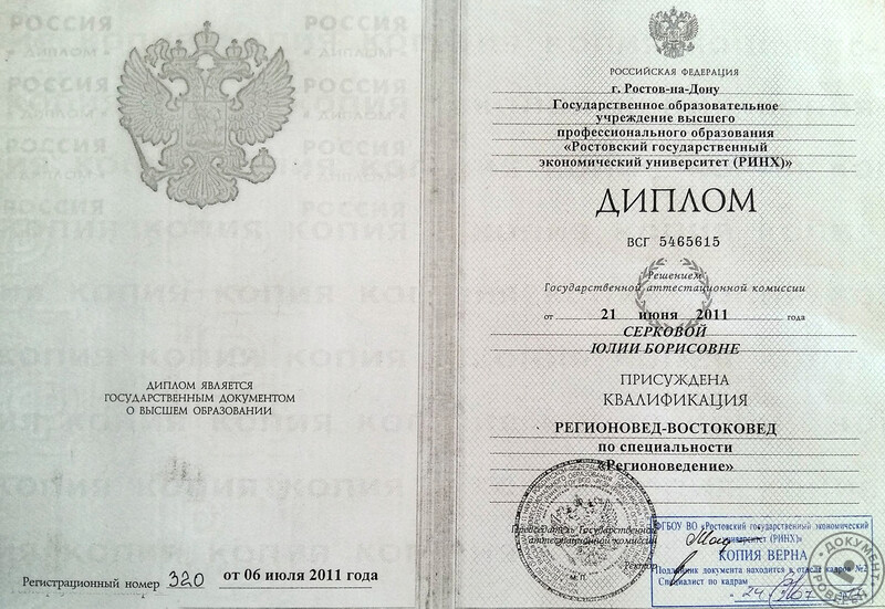 - Ростовский государственный экономический университет, факультет лингвистики и журналистики, специальность – востоковедение (2011 г.).