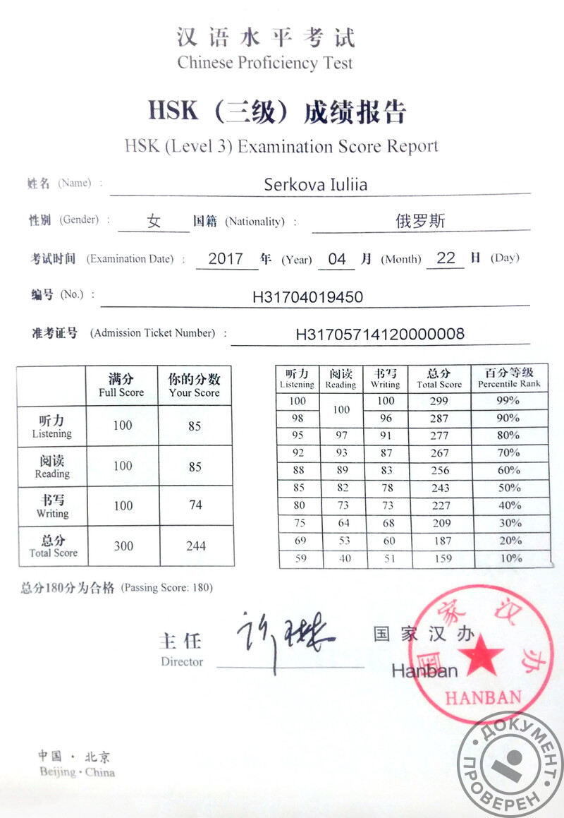 - Сертификаты HSK, Level 3 (2017 г.).