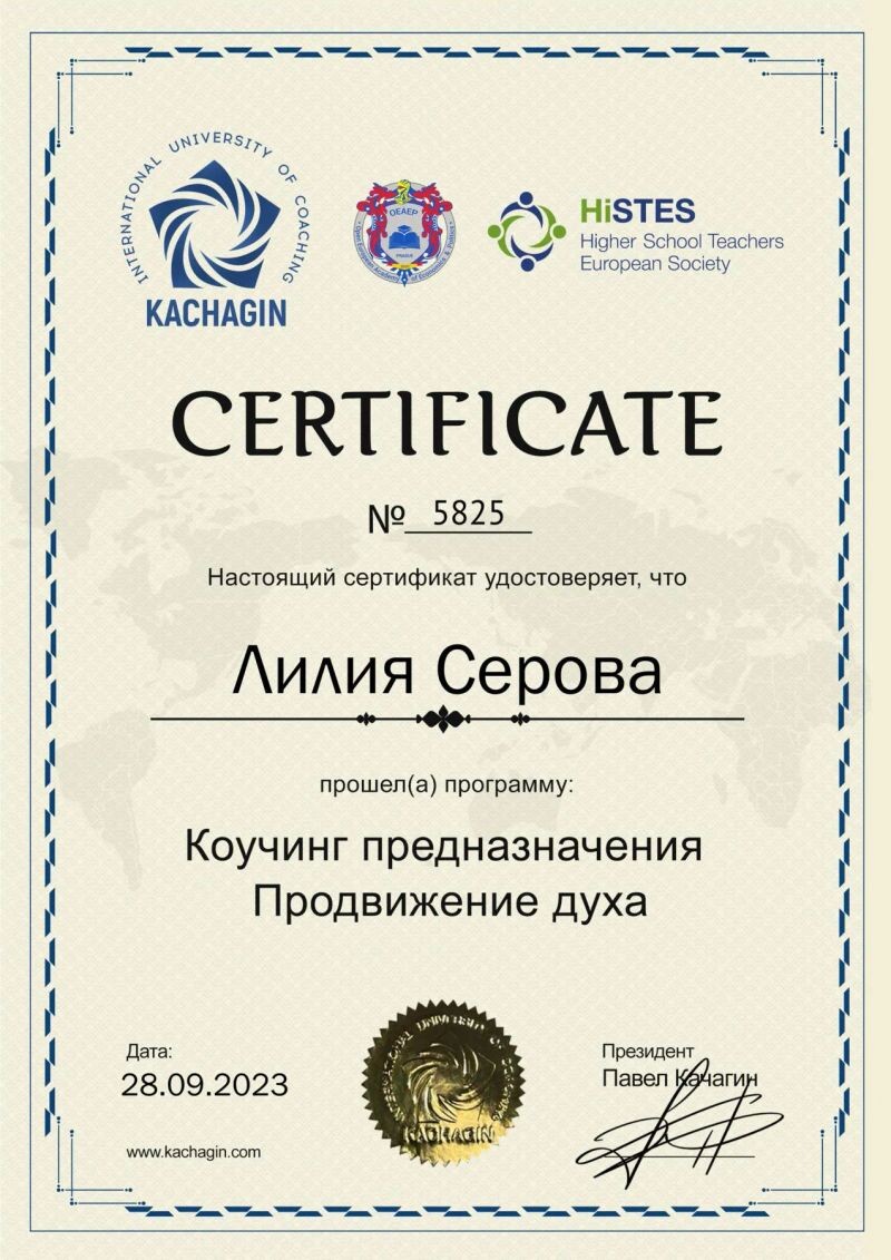 - Международный университет Павла Качагина, программа «Коучинг предназначения. Продвижение духа», 2023 г.