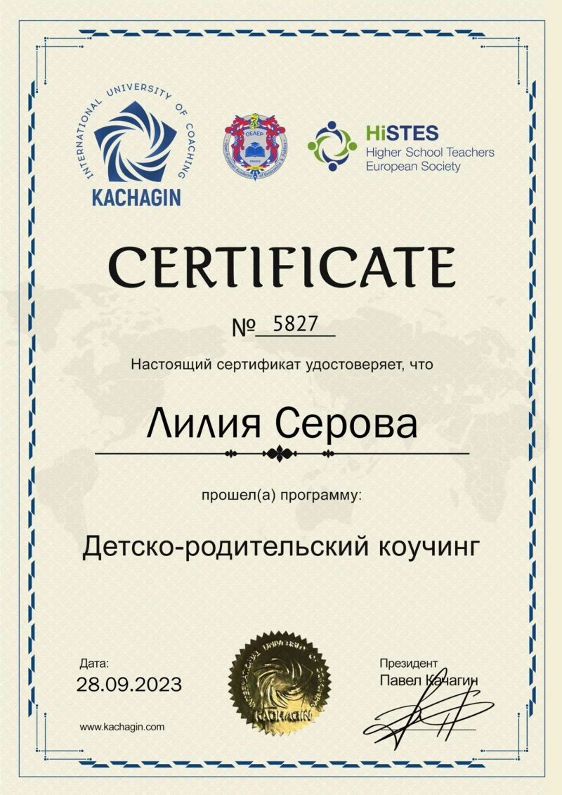 - Международный университет Павла Качагина, программа «Детско-родительский коучинг», 2023 г.