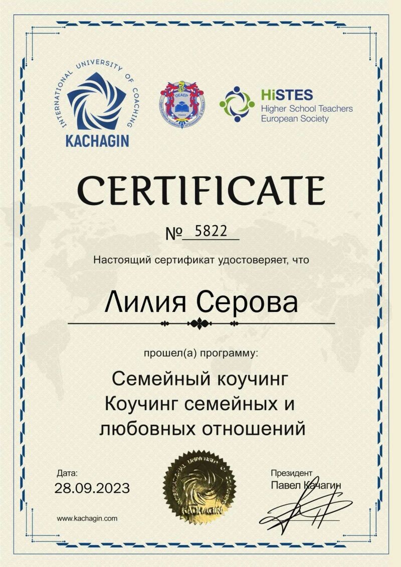 - Международный университет Павла Качагина, программа «Семейный коучинг. Коучинг семейных и любовных отношений», 2023 г.