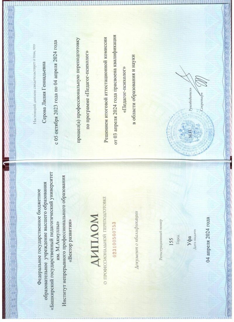 - Башкирский государственный педагогический университет им. М. Акмуллы, Институт непрерывного профессионального образования «Вектор развития», педагог-психолог, 2023–2024 гг.