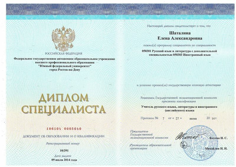 - ЮФУ, факультет лингвистики и словесности, учитель русского языка, литературы и английского языка, 2009–2014 гг.