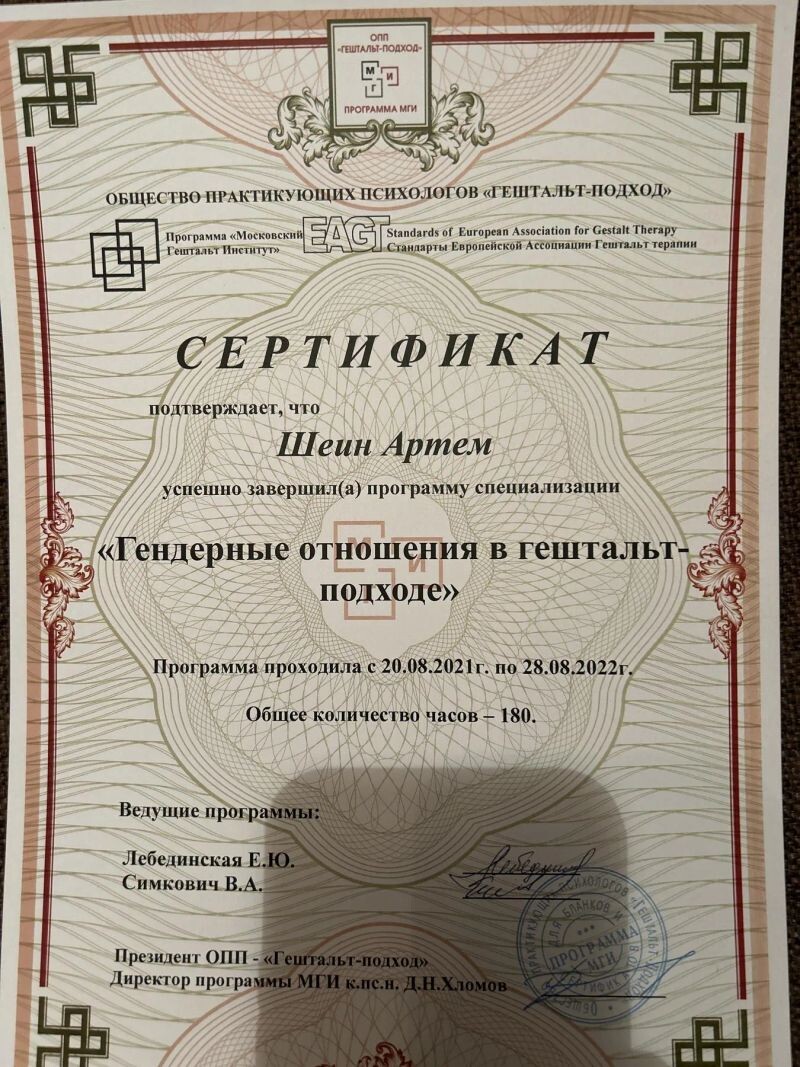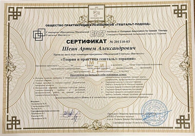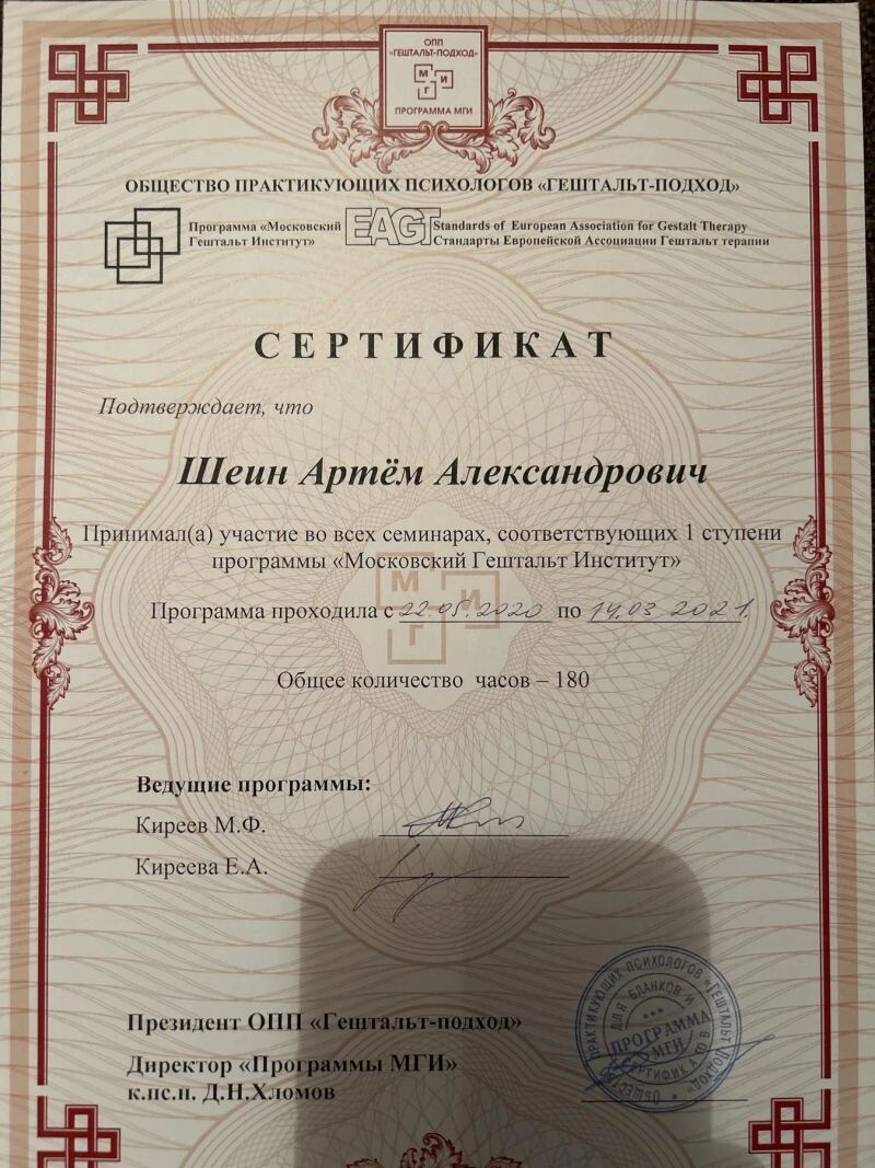 - Гештальт-подход, программа «Московский гештальт институт», 2020–2021 гг.