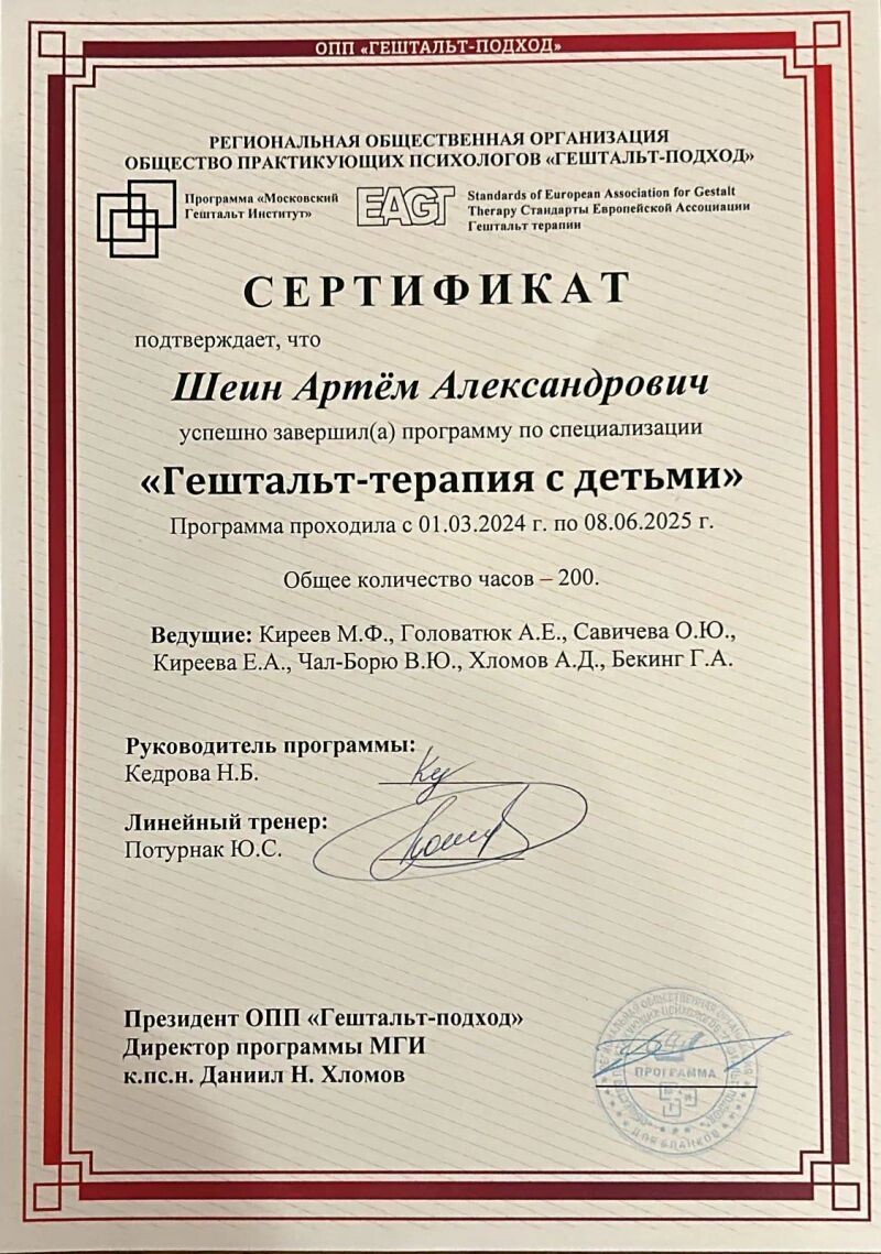 - Общество практикующих психологов «Гештальт-подход», программа «Гештальт-терапия с детьми», 2024–2025 гг.