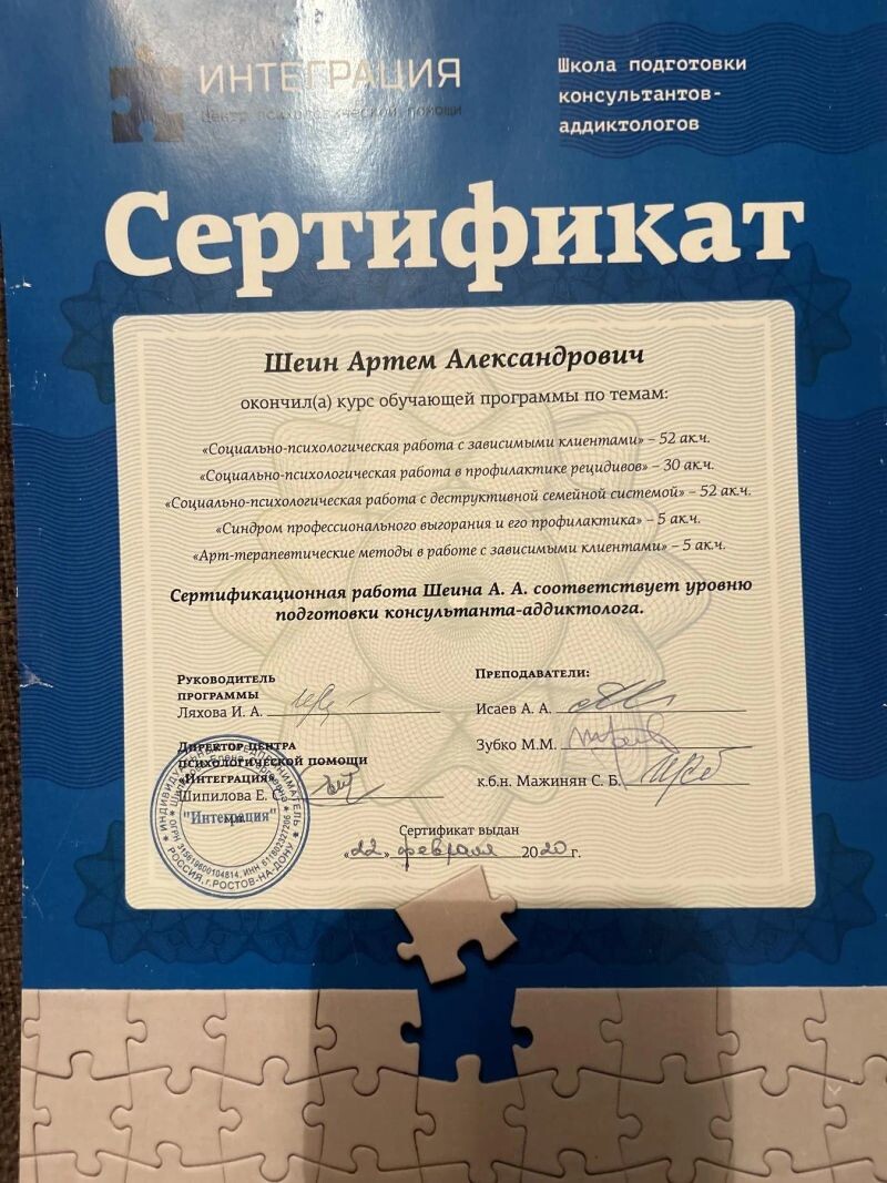 - Центр психологической помощи «Интеграция», консультант-аддиктолог, 2020 г.