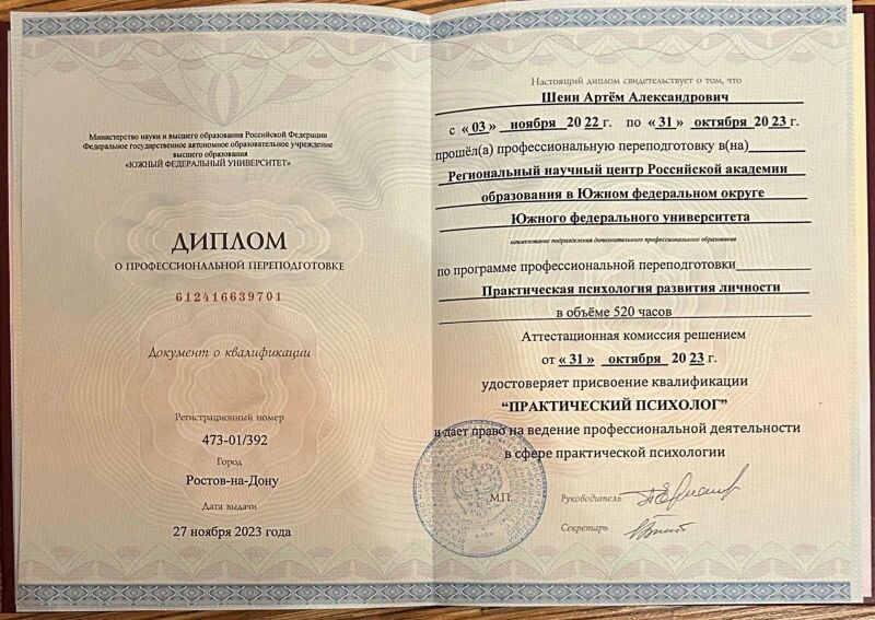 - Южный федеральный университет, программа «Практическая психология развития личности», квалификация «практический психолог», 2022–2023 гг.