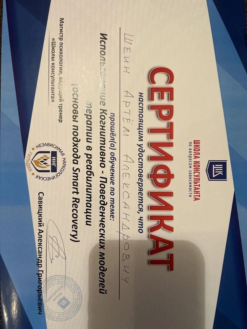 - Школа консультанта, обучение по теме «Использование когнитивно-поведенческих моделей терапии в реабилитации», 2023 г.