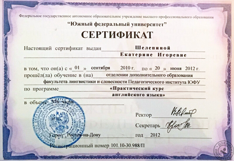 - экономический факультет ЮФУ, специальность – мировая экономика и международные экономические отношения, деловой английский и французский языки (2012 г.); Педагогический институт, факультет лингвистики и словесности, специальность – английский язык и межкультурные коммуникации, переводчик (2012 г.).